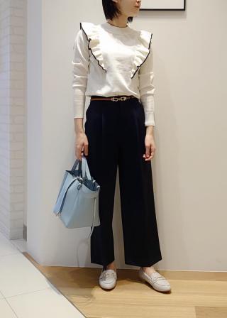おすすめコーデ:綺麗め〜カジュアルまで幅広く着回しができます。肩フリルで少し甘めの印象なので、ボトムはシンプルなものを選んで頂くと甘すぎないコーディネートを楽しめます。