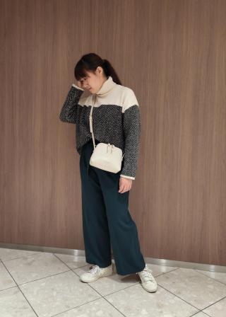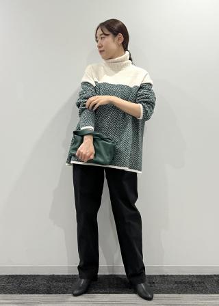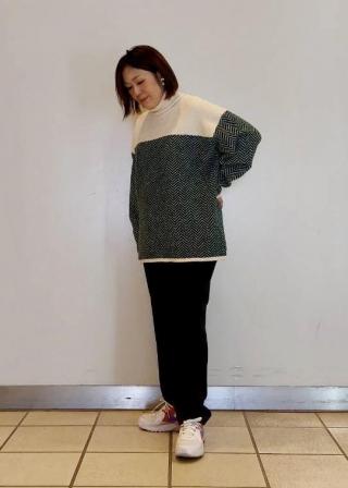 ヘリンボーン柄タートルネックプルオーバーです。ふんわり柔らかな生地感で、トップは無地で切り替えたデザインなので柄でもスッキリみえます。ゆったりと着こなすルーズシルエットで、ハイウエストボトムには裾をインしたり、腰回りがすっきりしたマーメイドスカートとの合わせもおすすめです。