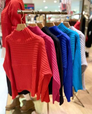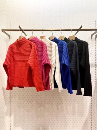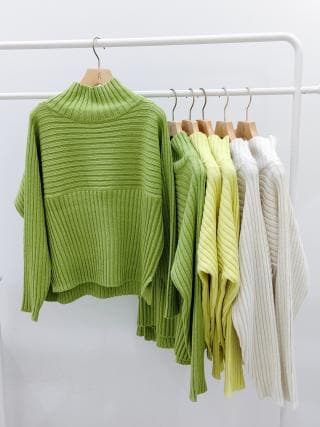 ・リブ編みの長袖ハイネックプルオーバー。
