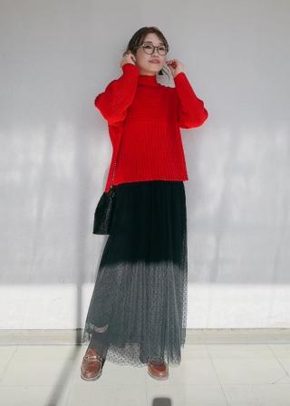 ・軽やか素材のロングスカートに合わせてトレンド感アップ。