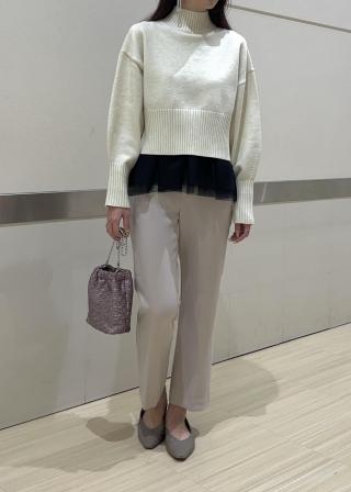 今年らしい短丈ニット。チクチク感は全くなくなめらかな肌触りです。袖に長めのリブが入っていて捲った時のシルエットも可愛いです。首元の締め付け感も気になりにくくタートル苦手な方にもおすすめです。