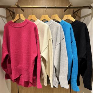 ドロップショルダーで、ゆったりシルエットのクルーネックニットです。シンプルデザイン