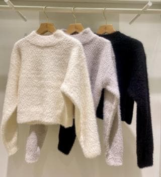 ふわふわのシャギーニットが可愛らしい雰囲気を演出してくれます。ショート丈なので低身長の方はバランスが取りやすくおすすめです!ハイネックなので首元までしっかり暖かいです。