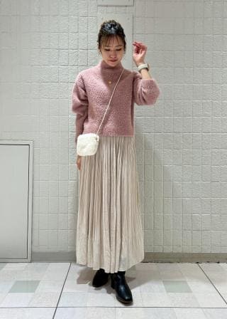 ふわふわのシャギーニットが可愛らしい雰囲気を演出してくれます。ショート丈なので低身長の方はバランスが取りやすくおすすめです!ハイネックなので首元までしっかり暖かいです。