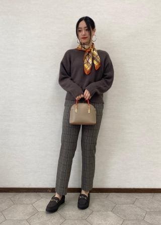 ・プリントスカーフを首元に巻くと華やぐ。
