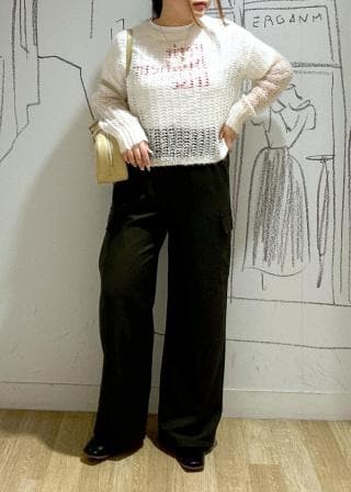 ・ふんわりとしたモヘア(モヘヤ)混の糸を大きめの柄の透かしで編んだニットプルオーバー。