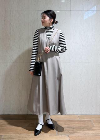 身体のラインを拾わない適度なゆとりがあるので一枚でも着用可能ですが、厚みも出過ぎない生地感なので上にジャンパースカートやカーディガンを重ねたレイヤードスタイルも可能で、着回し力も高いです。