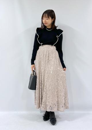フリルも中心に向かうデザインが、フィット感のあるニットですが、体型カバーしてくれます。