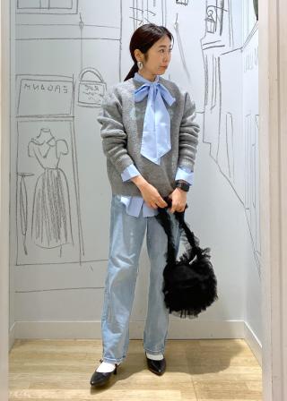 ・ピンクは薄いブルーデニムに合わせると春っぽい印象に。