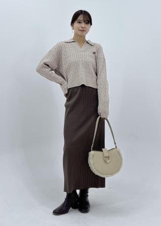 伸縮性と柔らかさのあるニットです。薄手のシャツやロンTならレイヤードが可能。腰に少し掛かるショート丈なのでボトムスのシルエットを選ばすバランスよく合わせられます。ケーブル編みとロゴ刺繍で華やぎも申し分なしです♪