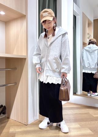 ツヤ感のある素材なので、カジュアルなイメージのあるフーディーですが綺麗めなスタイルにも馴染みやすいです。