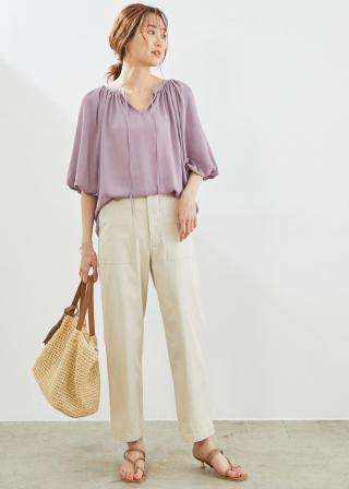 ・ふんわりパフスリーブと、バックネックのリボンがマッチしたプルオーバーブラウス。