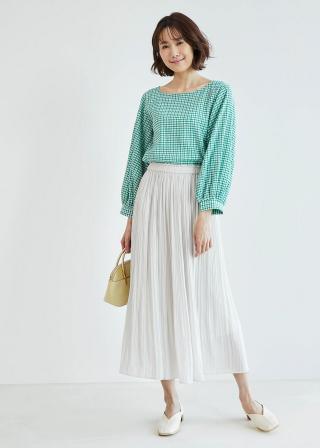 ・無地のハイウエストスカートにインしてきちんと感をアピール。