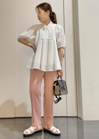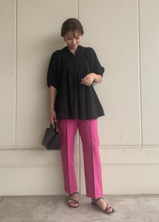 おすすめコーデ:長めの着丈のブラウスにはなるので、すっきり着こなすなら細身のパンツとの合わせがオススメです!ワイド系のボトムと合わせて、リラックス感のあるスタイルもオススメです!