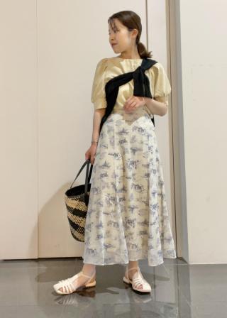 ・プリントのフレアスカートに合わせてエレガントコーデが完成。