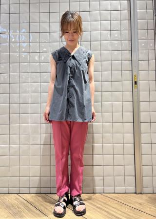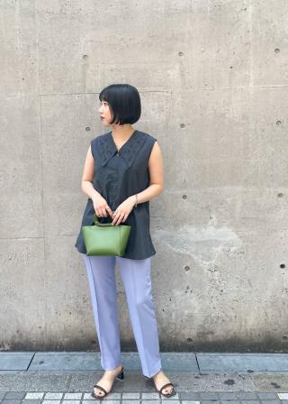 ・シャープな大襟に刺繍デザインを施したノースリーブブラウス。