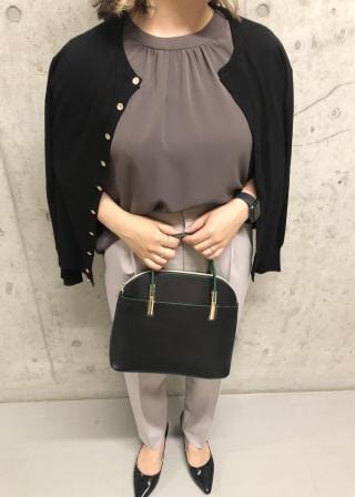 ・ネックボタン下の、僅かに素肌が覗くディテールがフェミニン。