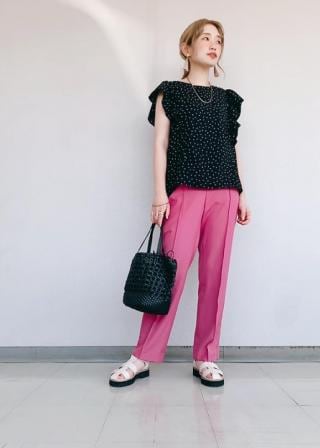 コーディネートは白ドットなので綺麗色ボトムスやスカートと合わせると今年らしくて素敵です。