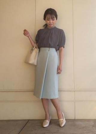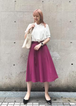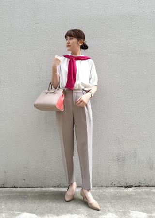 【オススメコーデ】暑い時期は1枚で着用し、秋〜春はカーディガンやジャケットと合わせて着用できます。オールシーズン使える万能ブラウスです。