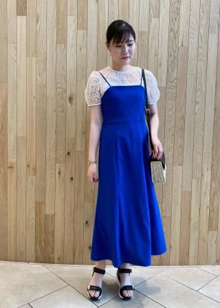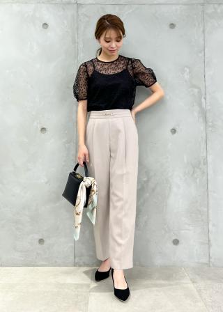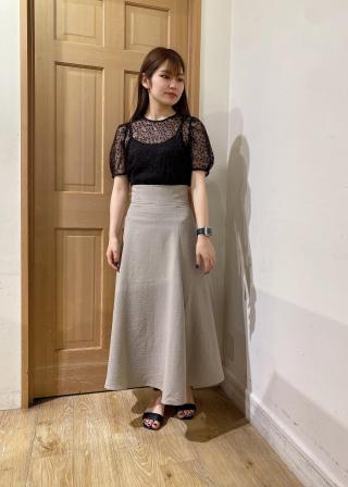 素材感:軽やかなチュール素材は透け感が涼しげな印象に。ややハリ感のある素材なので、パフスリーブも綺麗に出てくれます。キャミソールはしなやかで柔らかい素材感。