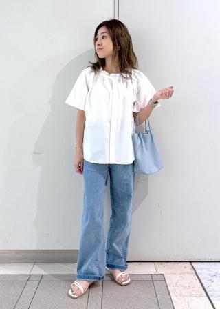 ・サックスブルーはホワイトのボトムに合わせて爽やかに決めて。
