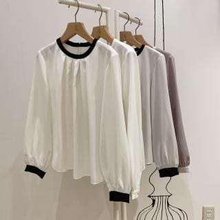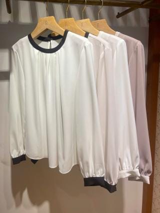 ・カラーレスタイプの長袖プルオーバーブラウス。