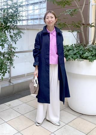 清々しい青色のシャツを黒のワイドパンツに合わせているスタッフさんの真似をして着るだけで、背が小さい私でも決まります。丈が短いので脚長効果大です。