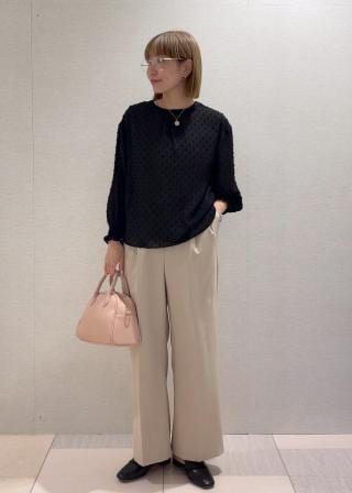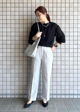 ・ハイウエストボトムに、裾をインして着こなすと女性らしさがアップ。