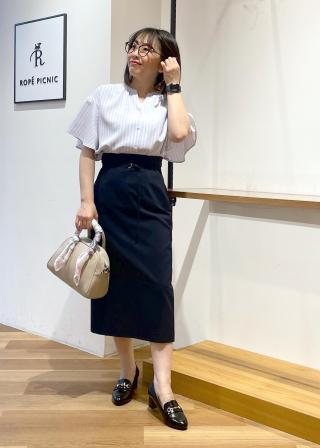 ・アイラインスカートに、裾インしてすっきりときれいめな着こなしが完成。