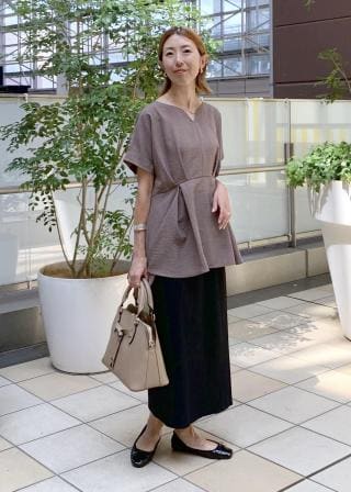 ハイウエスト切替えのペプラムシルエットなので体型カバーにも◎。