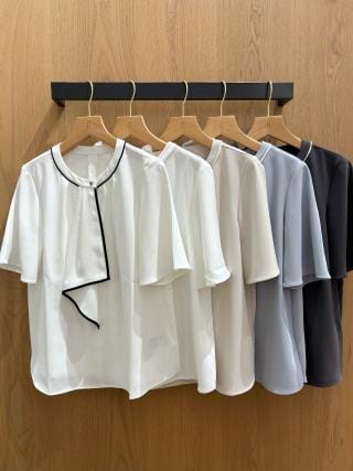 胸元のネクタイ風デザインがオフィス感がありコーデに馴染みやすいです。袖も爽やかに涼しく透け感もそこまでないので着やすいです。(キャミソール必須)