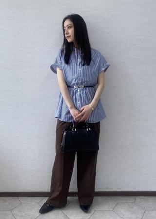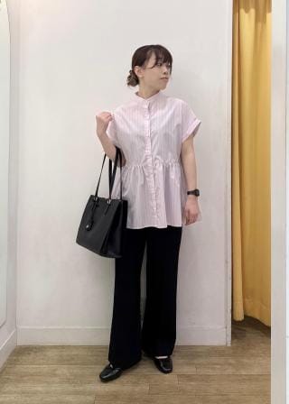 ・きれいめなスラックスを合わせれば、きちんと感があるオフィスカジュアルスタイルに。