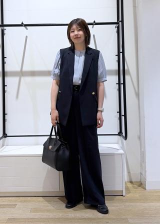 ・センタープレス入りのボリュームのあるワイドパンツ(ガウチョ丈)との合わせで洗練された大人の着こなしに。