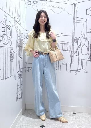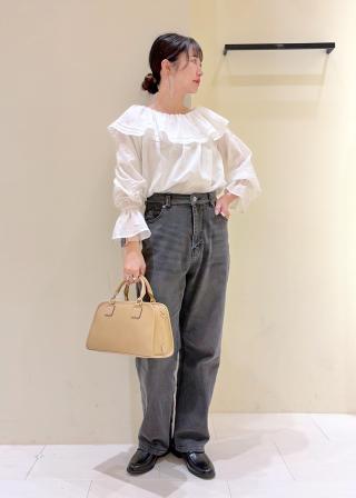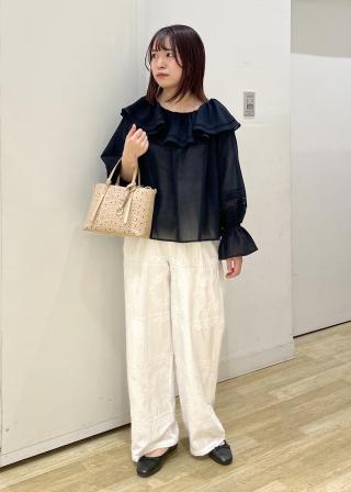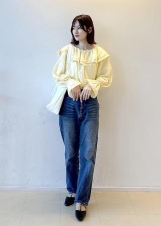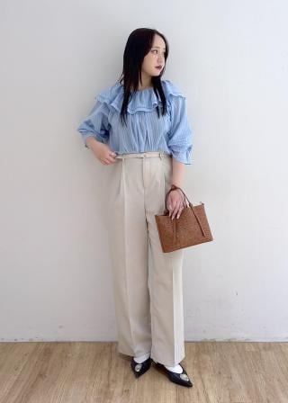 ・フェミニンなトップスにベーシックなボトムを合わせることで、洗練された大人カジュアルに。