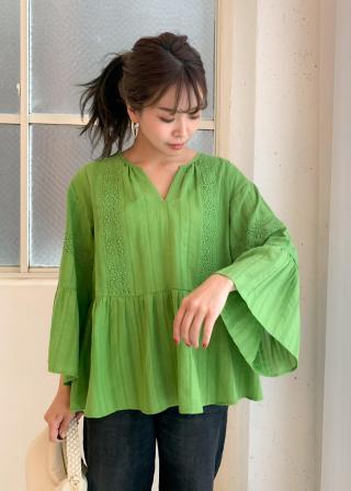 おすすめコーデ:ふんわりしたシルエットなので、細身かストレートラインのパンツがお勧めです。トレンド感のあるハーフパンツに合わせても◎