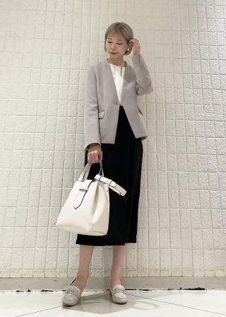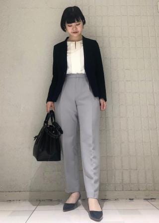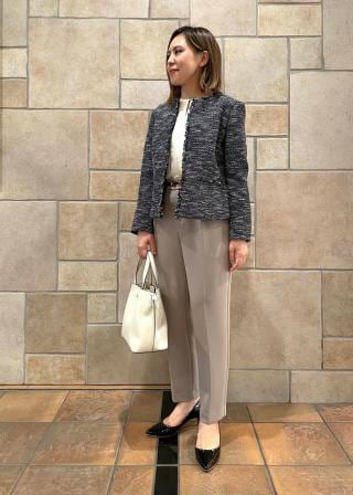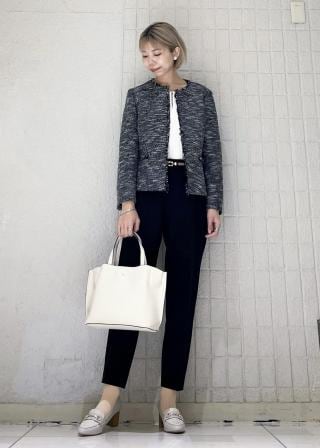 ・シンプルなテーパードパンツに合わせて通勤スタイルが完成。