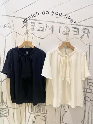 ・身頃がゆったりとしていて、着心地の良い半袖のボウタイブラウス。