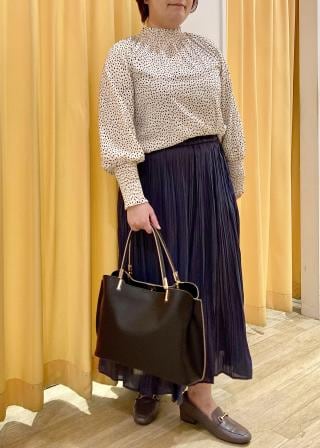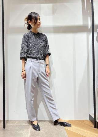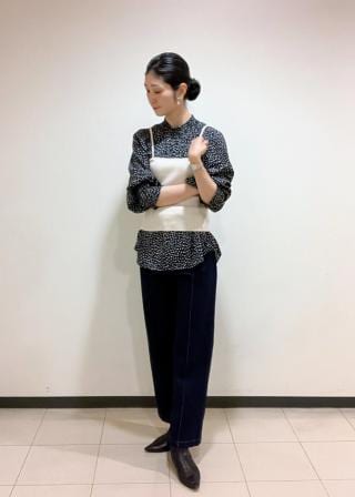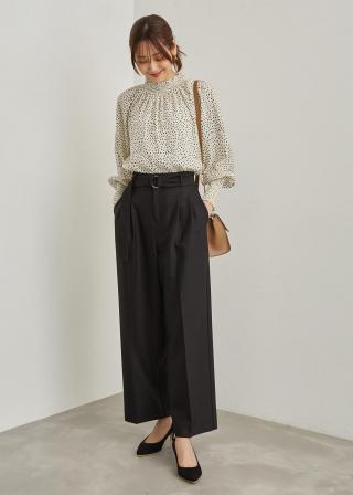 ・ドット柄は無地のワイドパンツに合わせてエレガントに仕上げて。