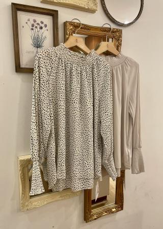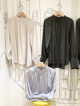 ・ネックと袖口にシャーリングを施した、長袖プルオーバーブラウス。