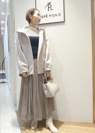 ・裾インでフレアスカート合わせもおすすめ。