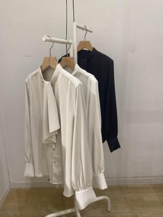 ・ドレープタイは取り外しができる、2WAY仕様の長袖ブラウス。