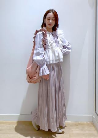 前後2weyのリボンブラウスです。薄めの色番はそれなりにシアー感があるので、インナー使いとしておすすめです。丈感は長めですが、生地自体が薄めなのでタックインしてももたつかずスッキリ着られます。袖のフリルも可愛いポイントです。