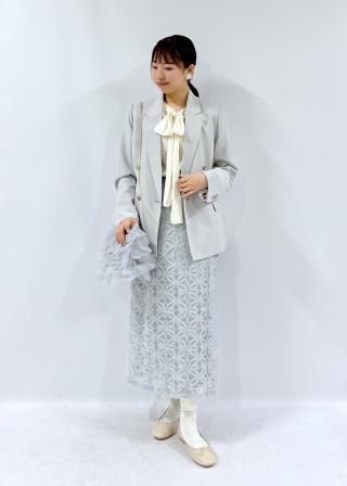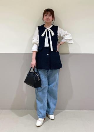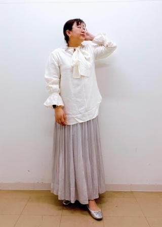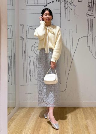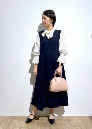 やや透け感のあるアイテムなので、中にキャミソールは必須です。薄手のため、冬の時期ですとニットやカーディガンのインナーにし、リボンを出していただく事で可愛らしいスタイリングになります。