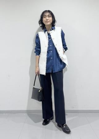 ウエストをインにしてベルトでマークした着こなしもおすすめ。