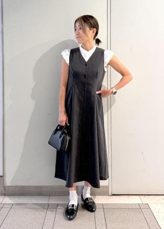 154cmで38サイズ着用。短すぎないショート丈でなので、アウトスタイルでもお腹周りをカバーしつつ、スッキリとした印象になります。