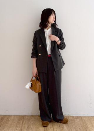 ボタンを一個開け襟を折ることで、抜け感を出しました◎