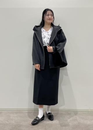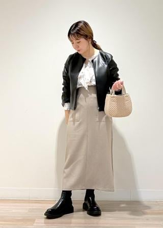 ・落ち着いたモノトーン調で甘くなりすぎず、大人の着こなしに最適。