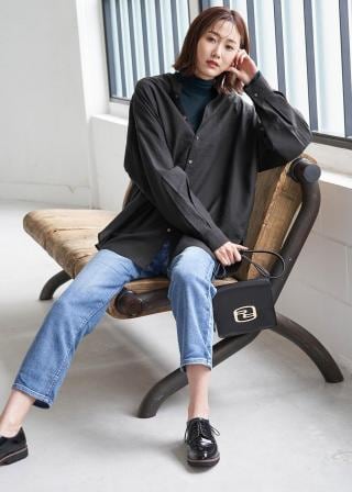シャツとインナーを同色系でにするとまとまりがでます。オーバーサイズで着るとこなれた印象に仕上がるのでドロップショルダーがおすすめです。