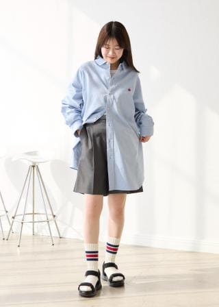 薄手で夏まで長く着用できます。着丈は長めのロングシャツ。気になるお腹やヒップ周りもカバーしてくれます。左胸にはワンポイント刺繍も◎
