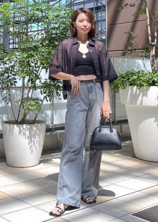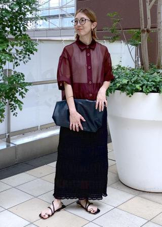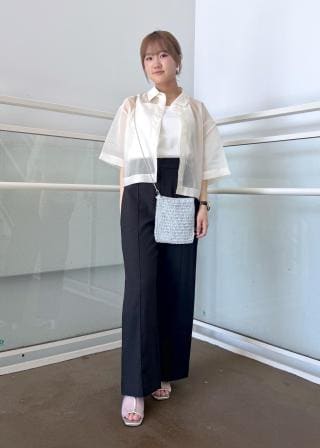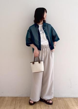 ・シアー素材&五分袖よりやや長めの袖で大胆な露出は避けながら清涼感のあるスタイルに。